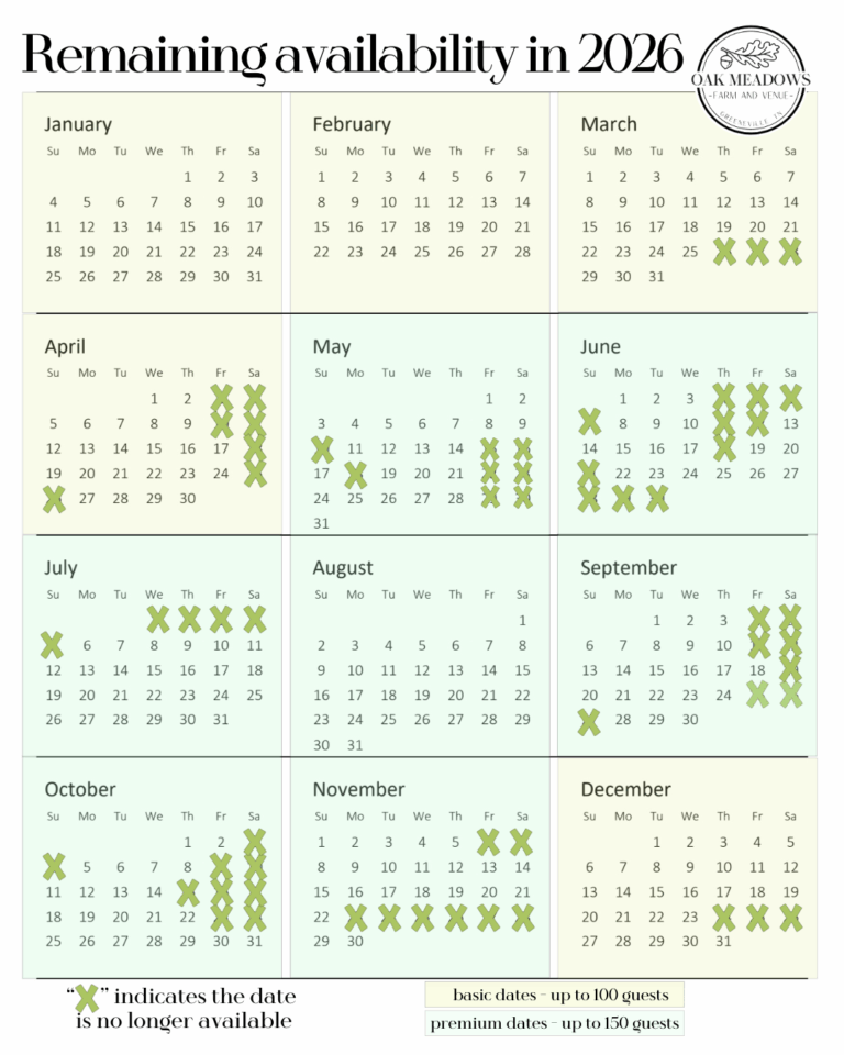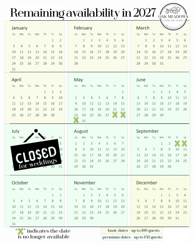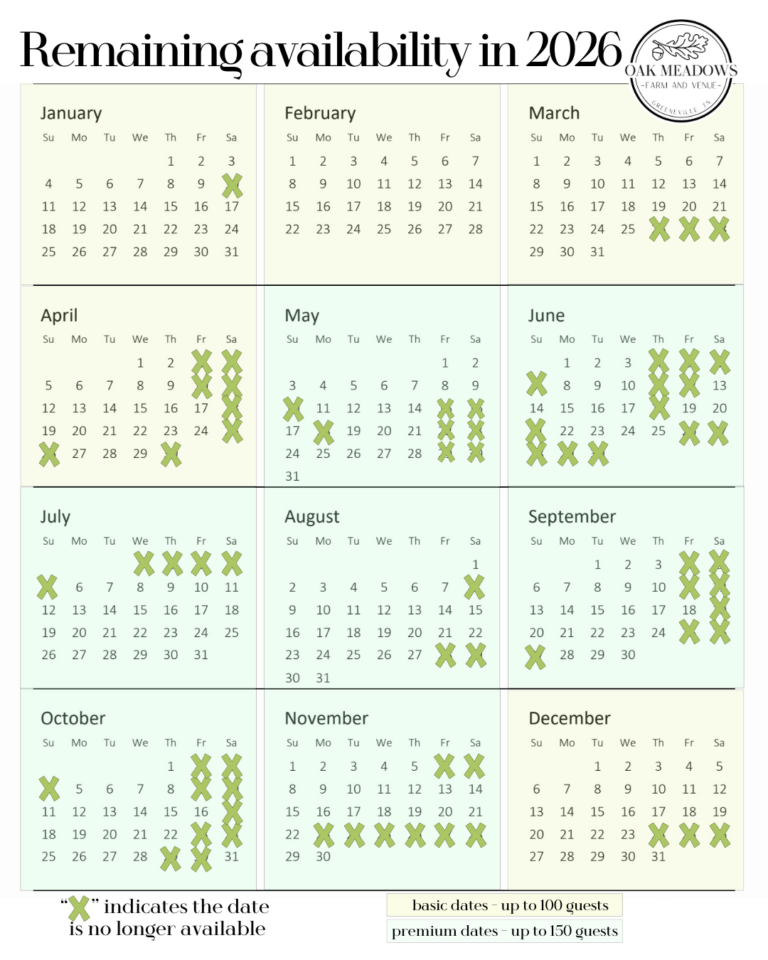 Searching for available wedding dates? Oak Meadows Farm is the perfect place to begin your forever together, with open dates for your dream wedding nestled in the heart of East Tennessee’s stunning mountain views. As a family-owned venue, we take pride in providing a warm, personal experience helping you celebrate love in our beautiful barn and enchanting outdoor spaces. Let us help you create lasting memories right here in East Tennessee!
